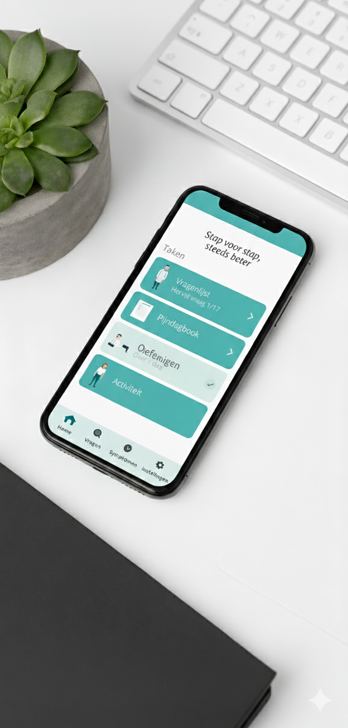 Projectomschrijving: Een behandelapp voor patiënten met rugklachten die geen specifieke behandeling in het ziekenhuis nodig hebben. In de app worden bewezen behandeling zoals oefentherapie, graded activity, en een eenvoudig pijndagboek gecombineerd. Deze app is een medisch hulpmiddel (MDR Klasse I).